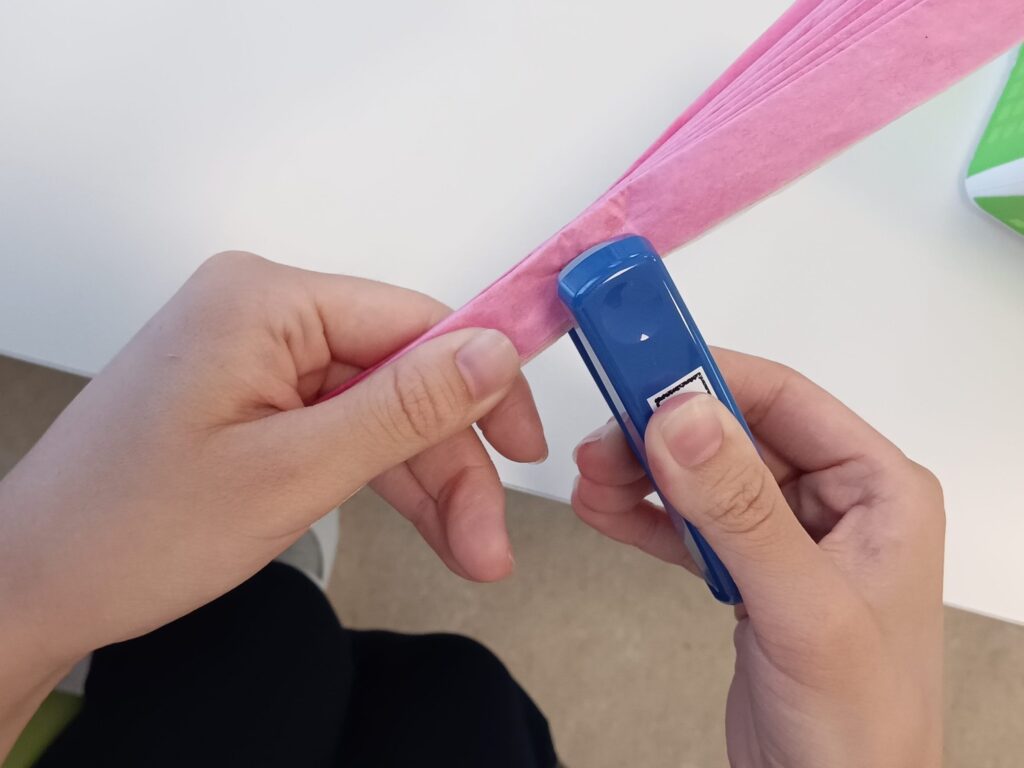 手順は支援員が花紙を8枚重ねて蛇腹に折り、中央を利用者さんにホチキス止めしてもらいます✨✨