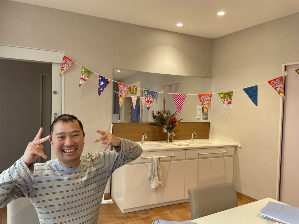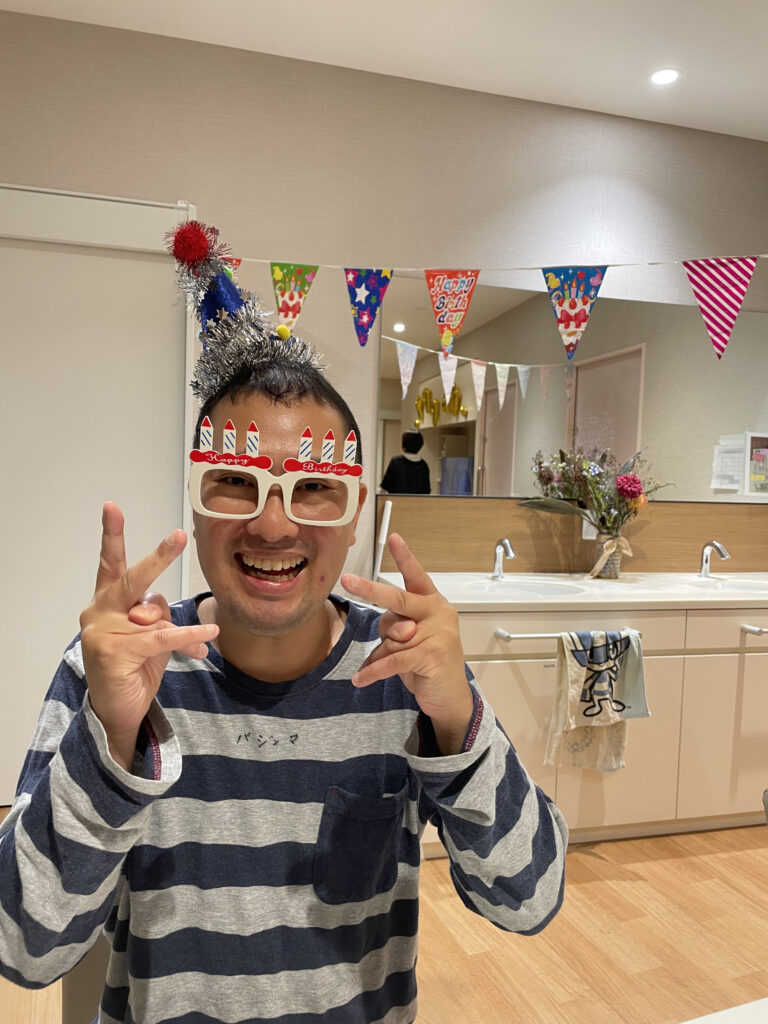 少し休憩した後はお待ちかねのお誕生日会です!皆でパーティーグッズを使って着飾り、主役を中心に盛り上げます!おかげで主役もニッコリいい笑顔です(笑)