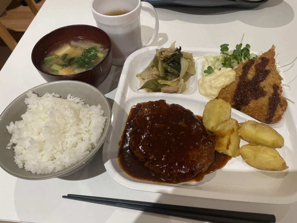 丁寧に手でこねた大きなハンバーグはふわふわでジューシーな食べ応え。アジフライやポテトも揚げたてのサクサクで大人気でした。白菜や大根、キャベツにカイワレと野菜もしっかりとって栄養満点の夕ご飯となりました。