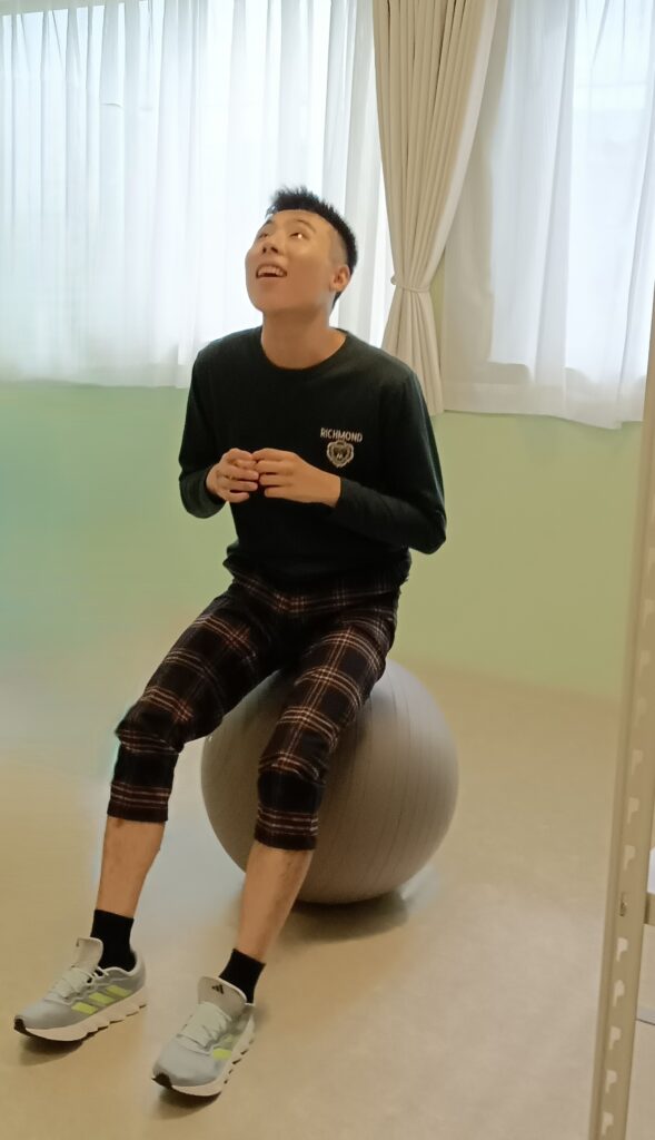 バランスボールに乗り、ゆるやかに体を揺らしながら楽しそうな笑顔を見せてくれました。小さな動きでも、体を動かす心地よさが伝わってきます。