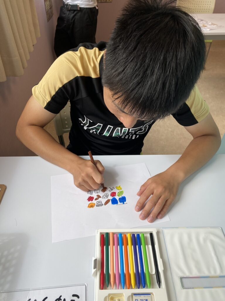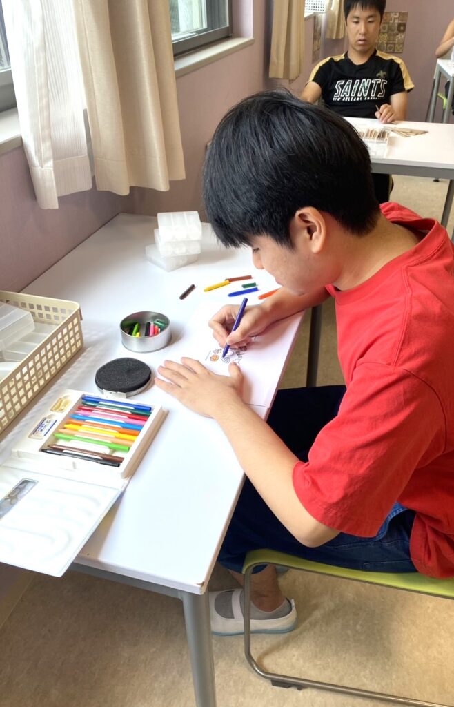 こちらでは、自由にお絵描きを楽しまれる利用者さんも。思い思いの色を選び、のびのびと筆を動かされていました。