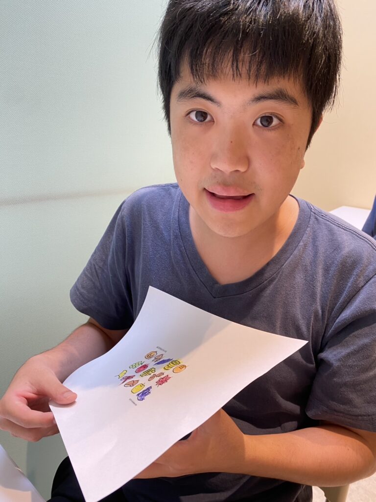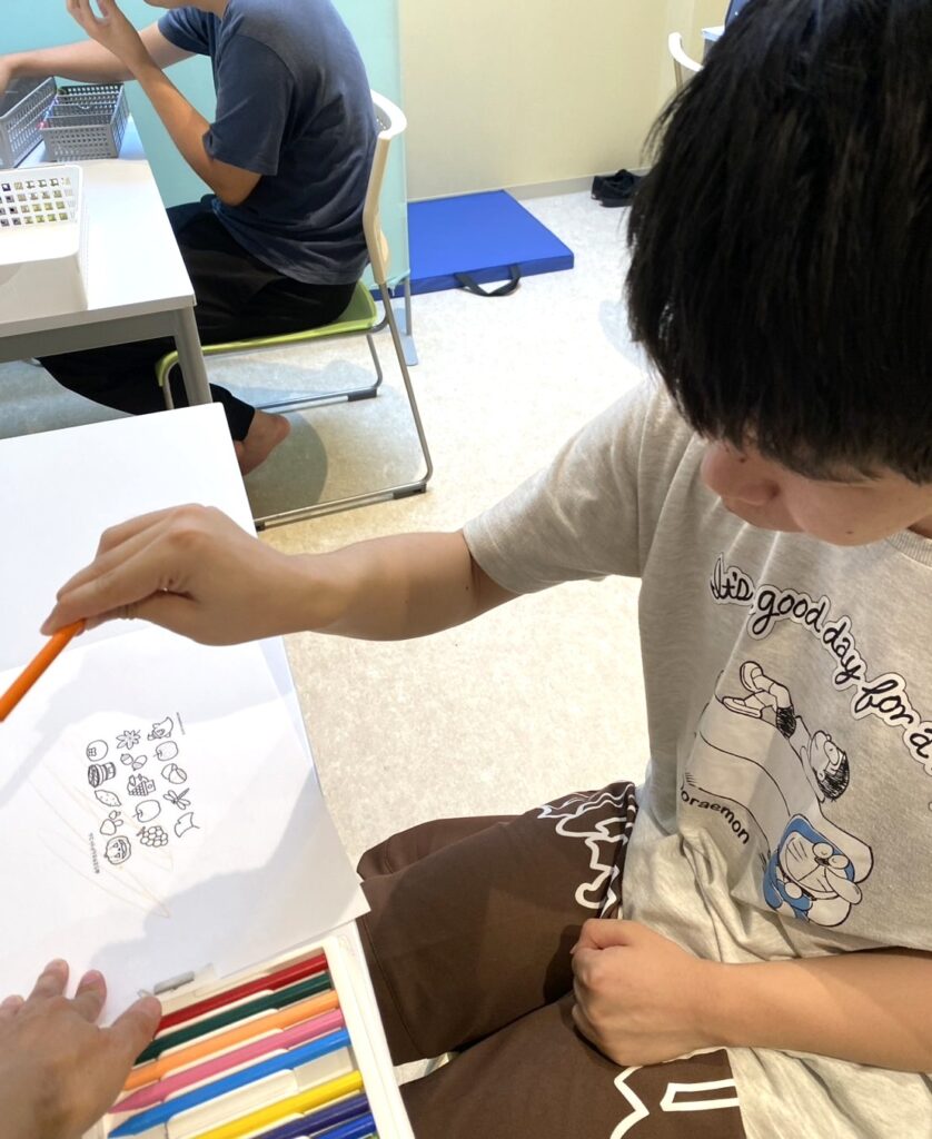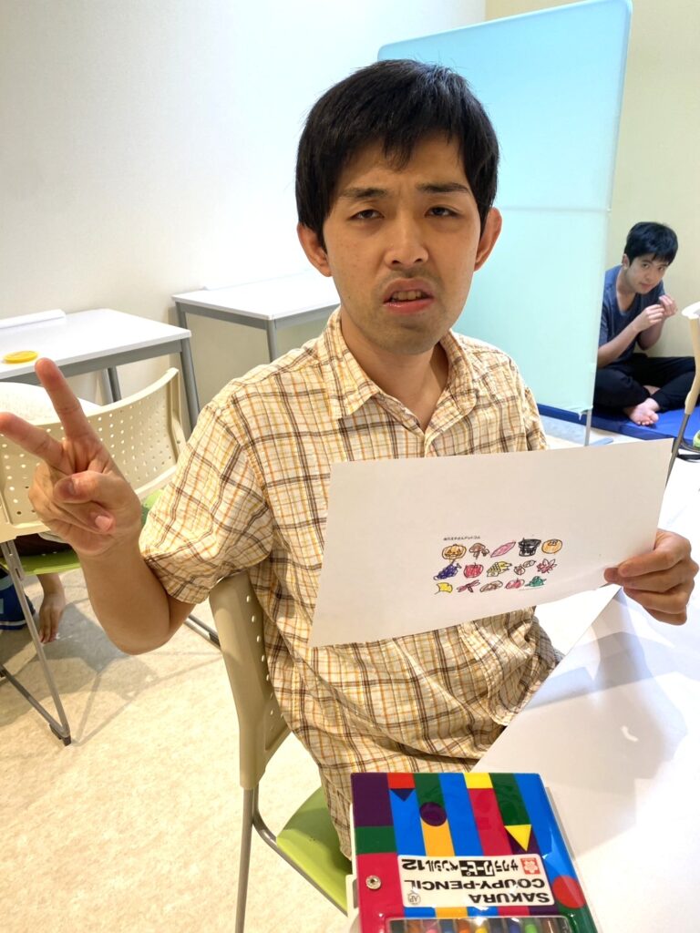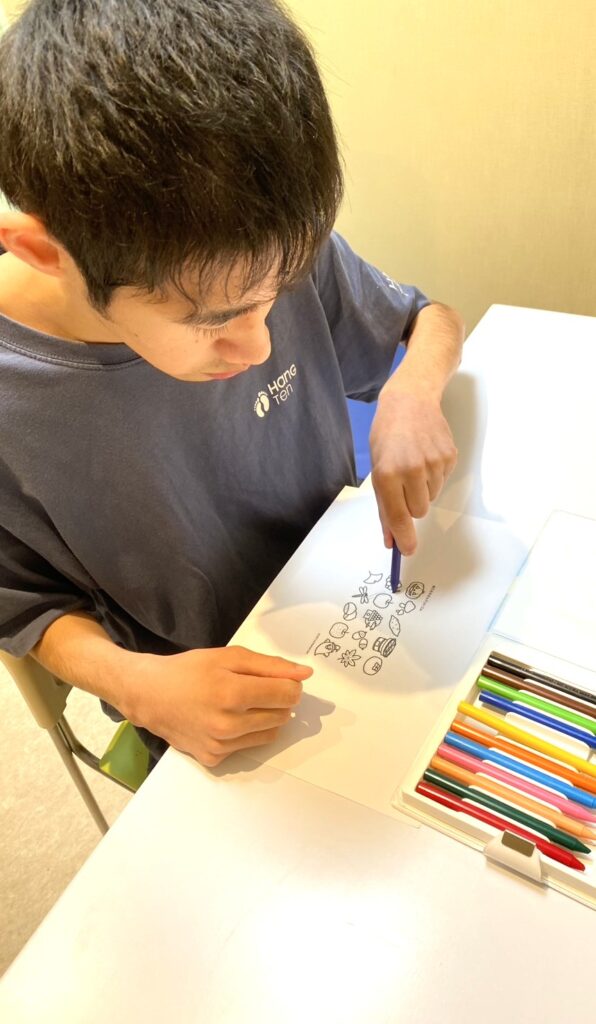 まずは、スタッフが紙と塗り絵をお渡しすると、「これは紅葉!」「ブドウだね」と楽しそうに名前を口にしながら取り組まれる様子が見られました。