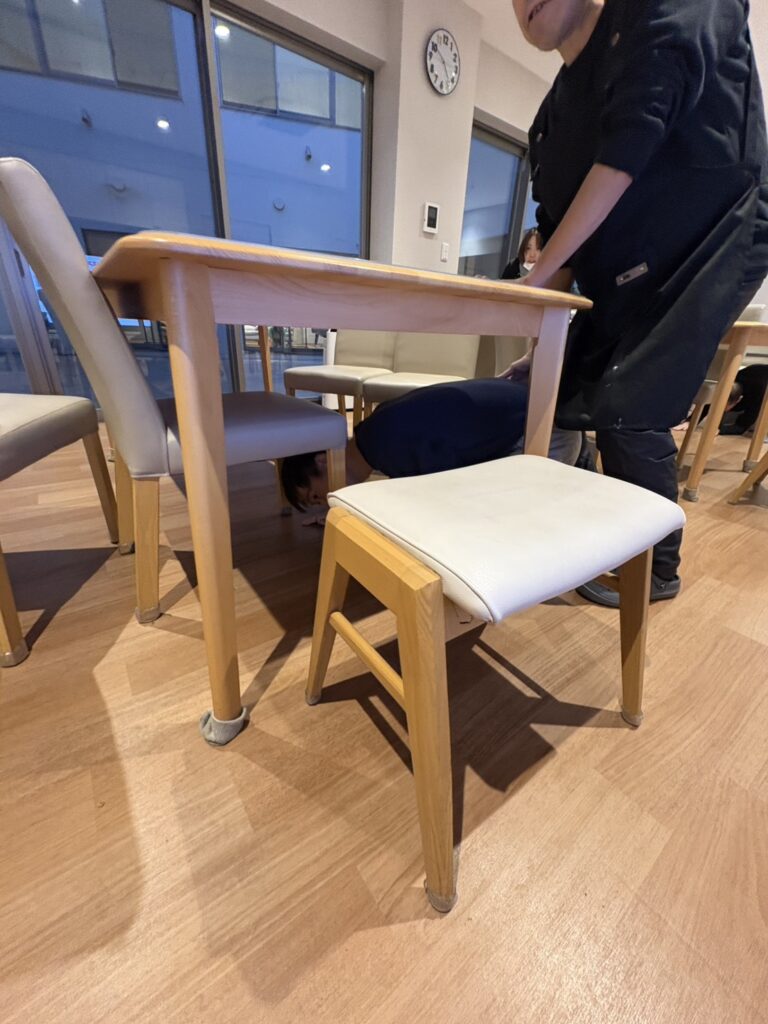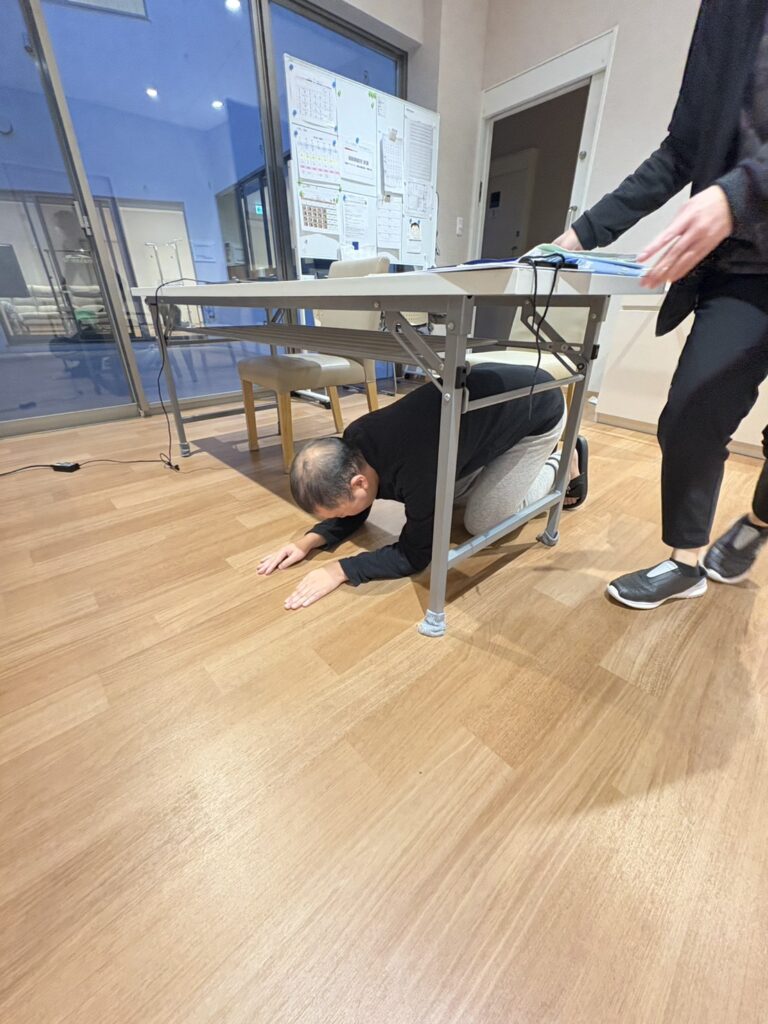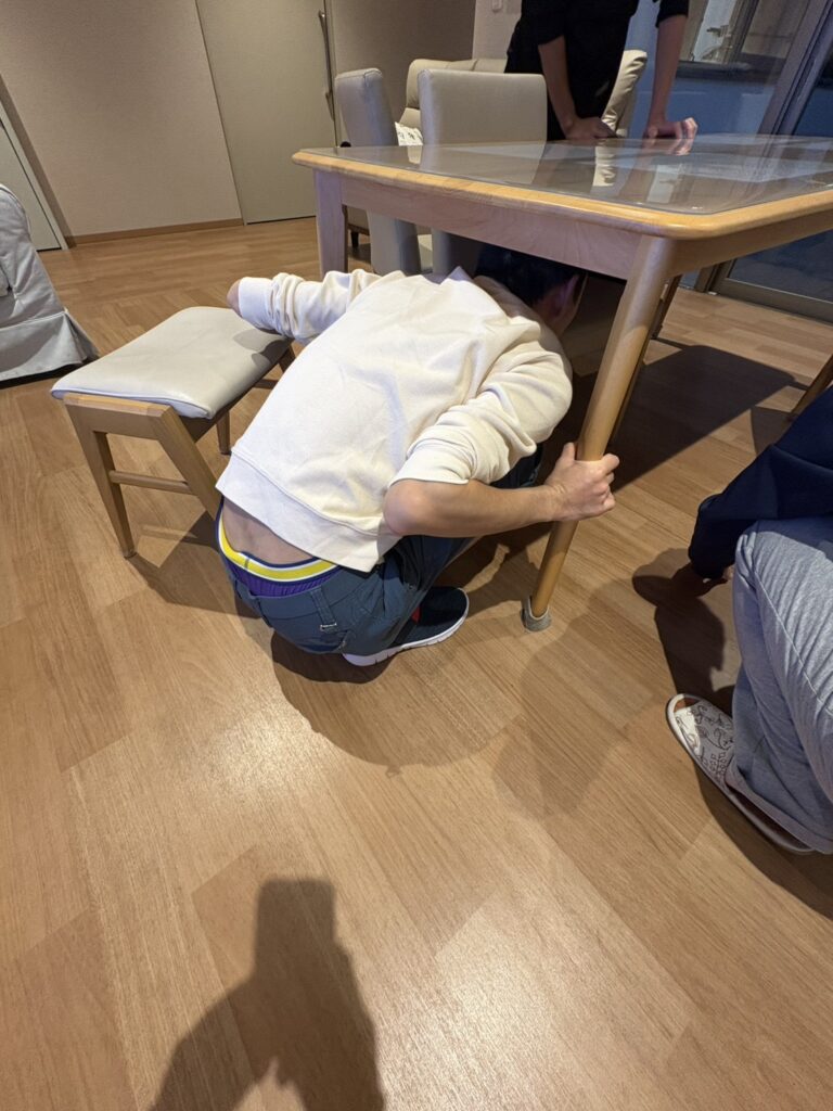 TVで緊急地震速報(警報)を流したらスタートです。スタッフの声かけで素早く身を守る体制をとります。ダイニングで過ごしていた方は、急いで「机の下」に身を隠します。