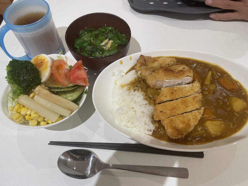 そして今夜は「カツカレー」「ホワイトアスパラとブロッコリーのサラダ」「えのきと玉子のお吸い物」でした。揚げたての豚カツを乗せた“ボリュームご飯”で、皆さん笑顔で1週間を終えることができました。