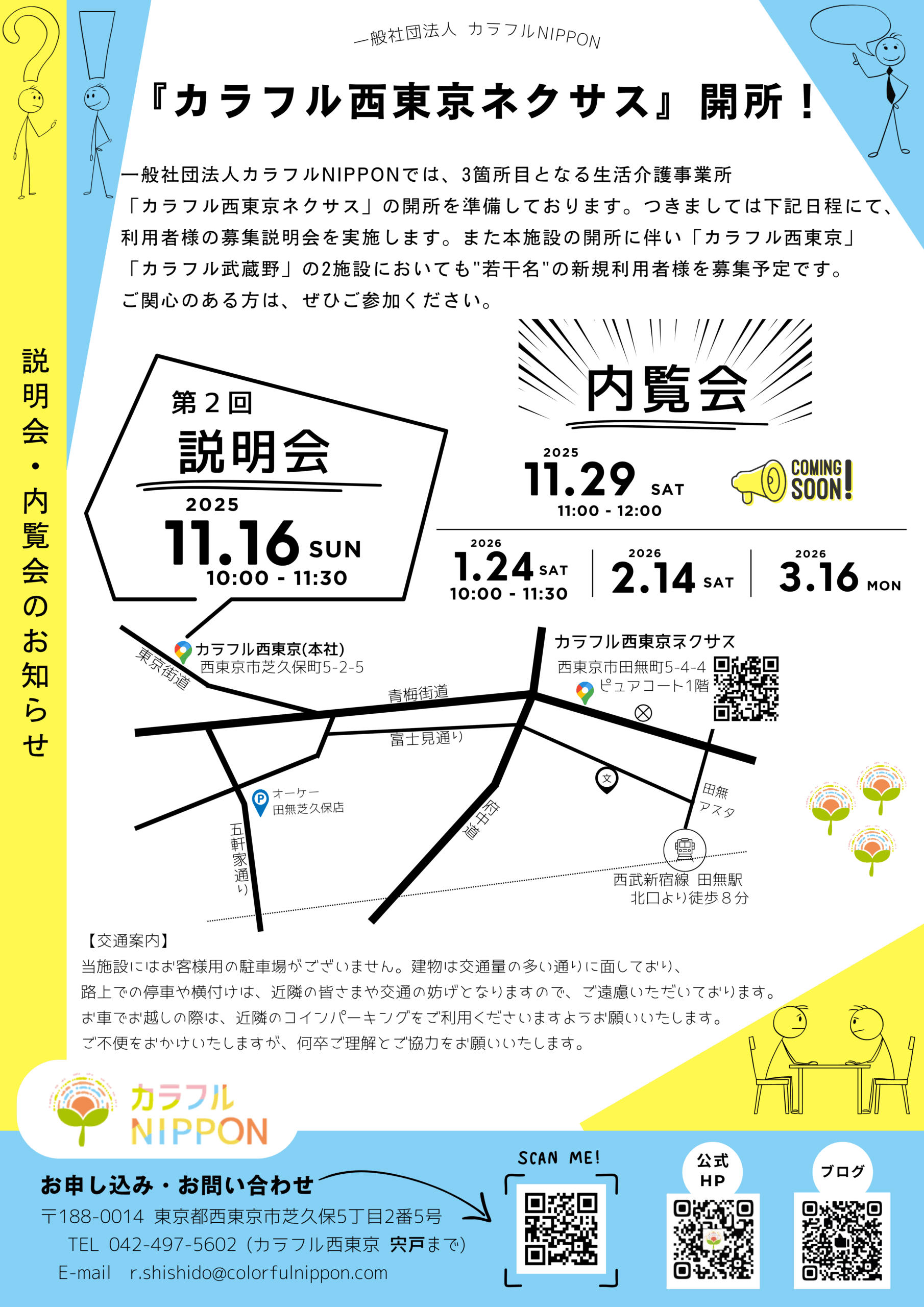 カラフルNIPPON“3つ目”の生活介護事業所「カラフル西東京ネクサス」につきまして、今後の内覧会及び説明会のご連絡です。学校や支援機関様など、関係各所にも別途チラシを配布しておりますが、こちらでも詳細ご確認いただければと思います。