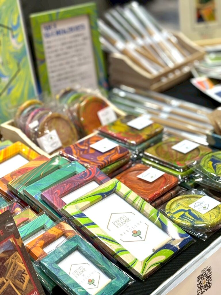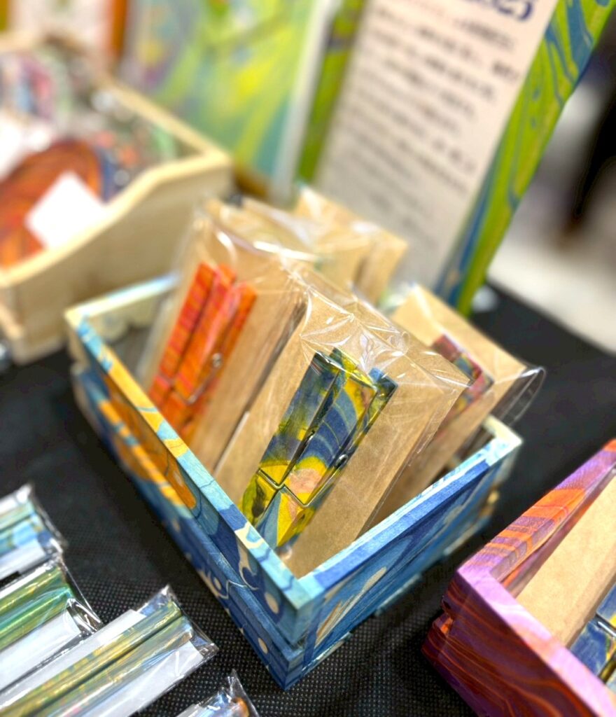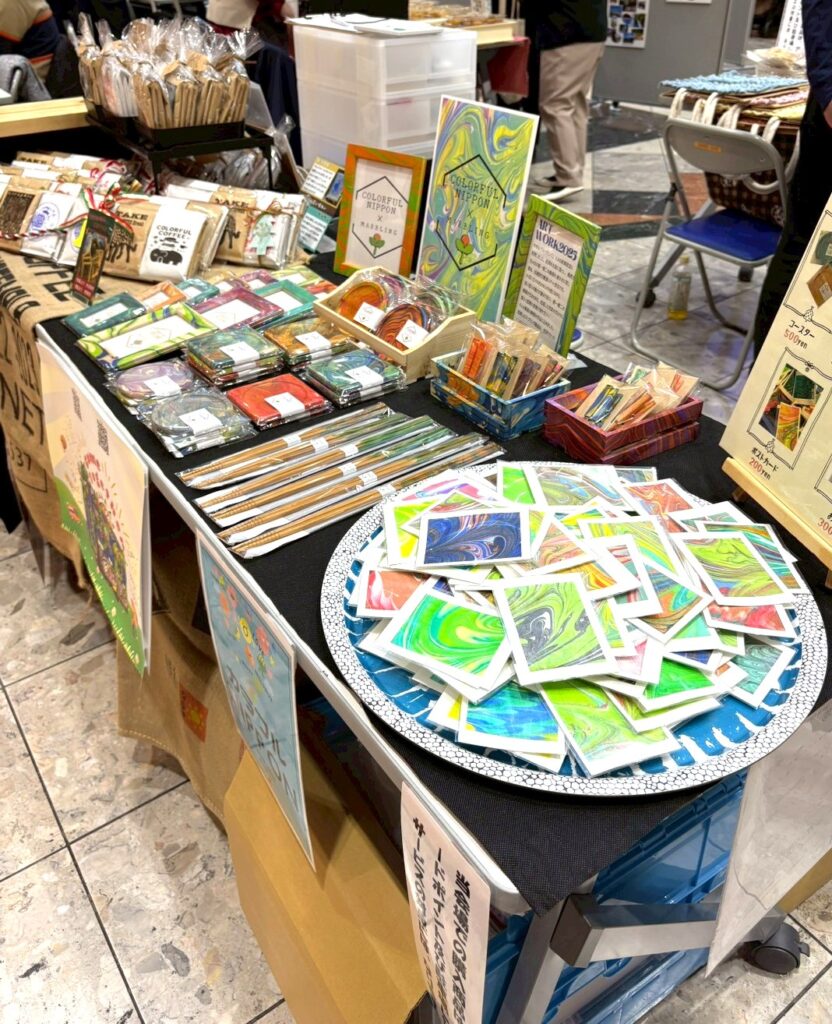 マーブリング作品も引き続き高い評価をいただきました。水面に広がる色を模様として写し取るこの技法で作られたフォトフレーム、箸、木製ピンチ、コースター、ポストカードは、どれも“世界に一つだけの作品”です。来場された保護者の方や一般のお客様からも「色合いがきれい」「選ぶのが楽しい」と声をかけていただきました。