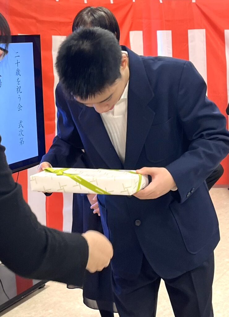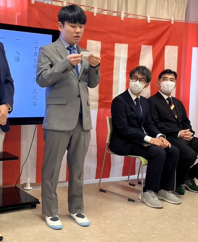 利用者さんによる挨拶では、原稿を手に、堂々とした姿で言葉を読み上げてくださいました。照れる様子はほとんどなく、その立ち姿からは「二十歳」という節目をしっかりと受け止めている様子が伝わってきます。
