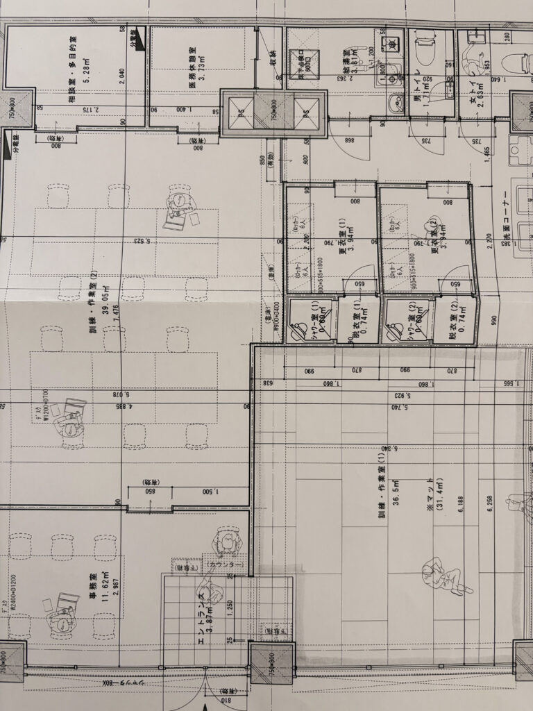 内覧会までのお楽しみという事であえて設計図でのご紹介とさせていただきますが、本施設は作業スペースの他に「マット」をひいたスペースを設けており、ストレッチやヨガ、柔術など身体を使ったプログラムができるようになっています。シャワー室や洗面台もあり、汗をかいても清潔に活動ができます。もちろん落ち着いて作業ができるスペースも壁で仕切った位置に広く確保しており、今後様々な活動に生かしていきたいと思っています。