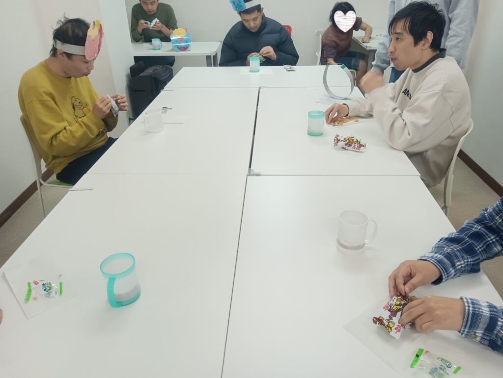 こんにちは!今日は「節分」ということで・・・カラフル武蔵野では日中イベントを行いました。この日のために、利用者さんそれぞれが好きな形の「目」や「鼻」「口」を選び、オリジナルな「鬼のお面」を制作してきました。どれも味があって良い作品ですよね(笑)!