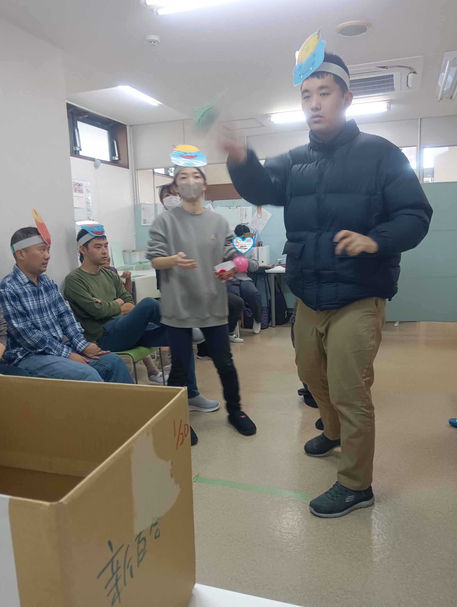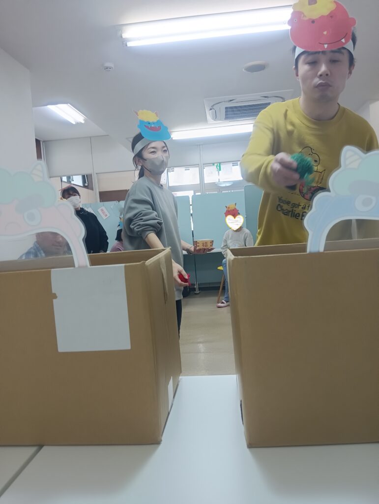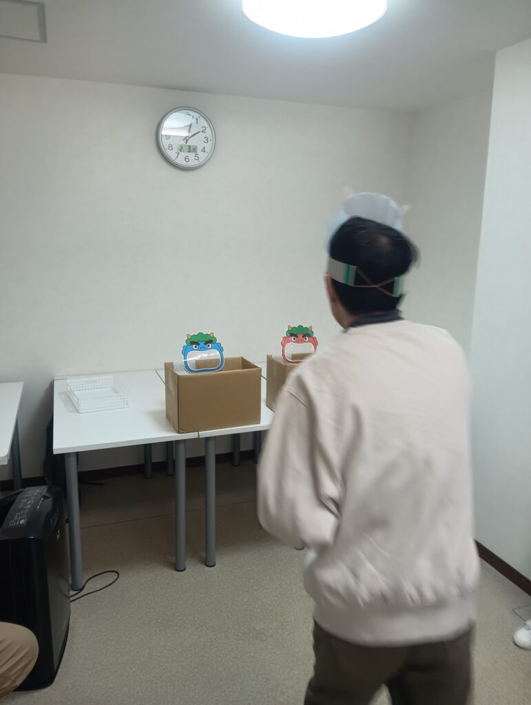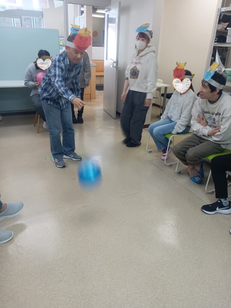 今日はそれぞれのお面をつけて、ミニゲーム「鬼をやっつけろ!ボウリング」と「豆まき風玉入れ」を行いました!