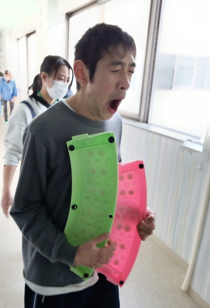 利用者さんが「これから一回目のサーキットをはじめます」と声をかけると、周りの皆さんも自然と視線が集まり、活動の始まりを共有する空気が広がります。